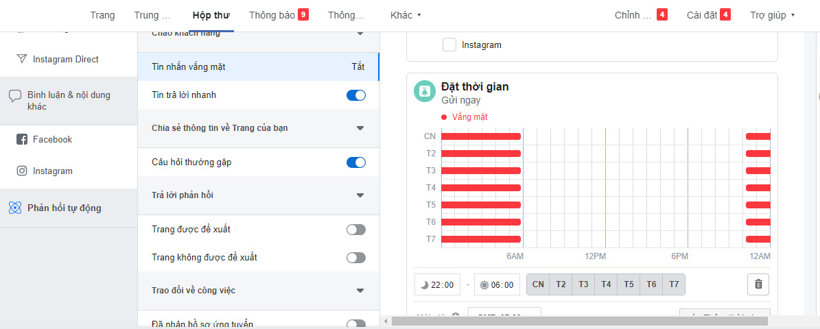 Hiển thị giao diện để chúng ta điều chỉnh lịch trình hoạt động của Trang cũng như thời gian vắng mặt để trả lời tự động khi có người nhắn tin tới. Nếu muốn thêm khoảng thời gian khác thì nhấn Thêm thời gian bên dưới. Chẳng hạn với ví dụ dưới đây sẽ chọn vắng mặt từ 22h đêm hôm trước tới 6h sáng hôm sau.