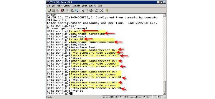 Giả dụ chúng ta muốn tạo VLAN 5 và 10. Chúng ta muốn đặt cổng 2 và 3 vào VLAN 5 (Marketing) và cổng 4 và 5 vào VLAN 10 (Nhân sự). Sau đây là cách thực hiện trên switch Cisco 2950:
