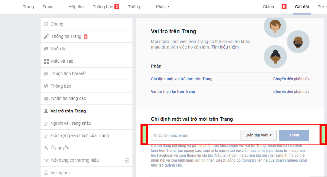 Bước 3 : Ở mục Chỉ định một vai trò mới trên Trang bạn hãy nhập tên người bạn muốn thêm. Sau đó chọn quyền trên trang mà bạn muốn người này làm. Tiếp tục ấn nút Thêm.